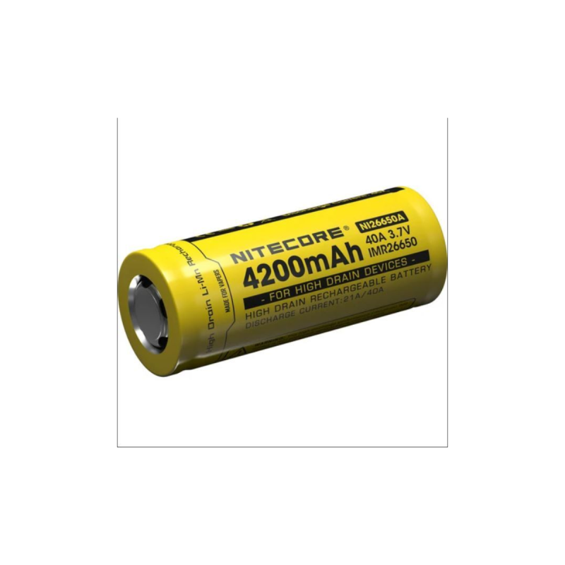 Le Nitecore NI26650 est une batterie rechargeable à forte consommation de 4200 mAh 40 A IMR 26650 spécialement conçue pour les appareils de vapotage. La capacité de 4 200 mAh offre une longue durée de fonctionnement avec un ampérage d'impulsion maximum élevé de 40 A et une décharge continue maximale de 21 A. Conçue avec une connexion à dessus plat, cette batterie contient un noyau Panasonic fiable.